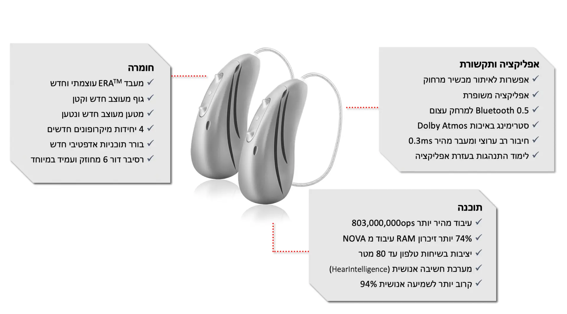 בלב כל מכשיר עומד מעבד ERA™ החדש, שמספק עוצמה וחישוב מתקדם של למעלה מ-803 מיליון פעולות בשנייה. המעבד אחראי על ניתוח כל צליל בסביבה ומאפשר שמיעה טבעית ונקייה מרעשים – תוצאה שמקרבת את המשתמש לשמיעה אנושית ב-94%. בנוסף, גוף המכשיר עבר עיצוב מחדש – הוא קטן, אלגנטי ומודרני, כך שניתן לשאת אותו בנוחות ובביטחון מלא גם עבור מי שמעדיף מכשירי שמיעה קטנים או מכשיר שמיעה זעיר כמעט בלתי נראה לעין. המטען החדשני בעיצובו מאפשר טעינה מהירה, והוא חלק בלתי נפרד מהמהפכה של מכשירי שמיעה נטענים. המטען נייד, שקט, וכולל מערכת טעינה נפרדת שמבודדת את הרכיבים האלקטרוניים להגנה מרבית.